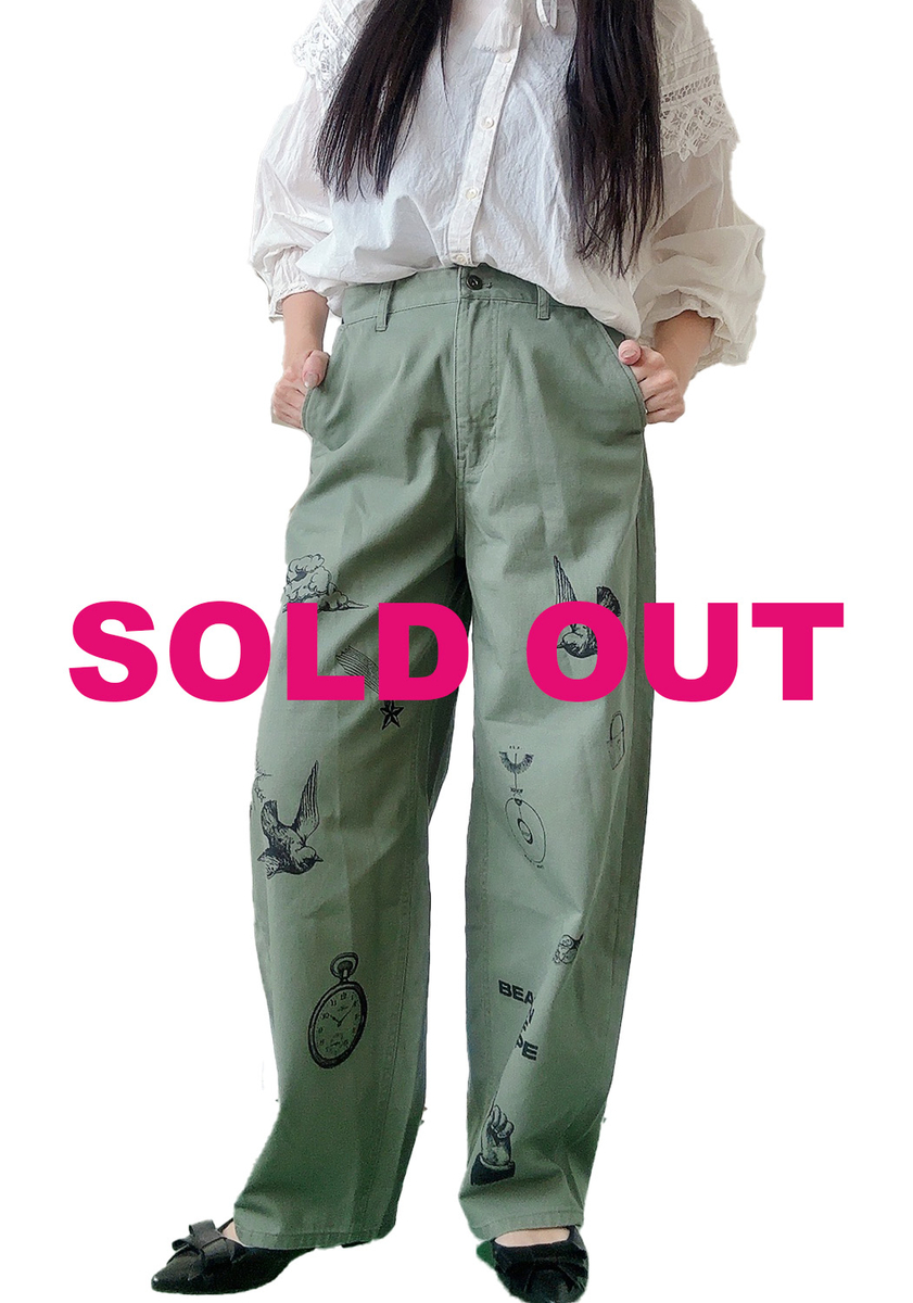 ミリタリーパンツというよりはカーキ色のストレートチノパンツという雰囲気。